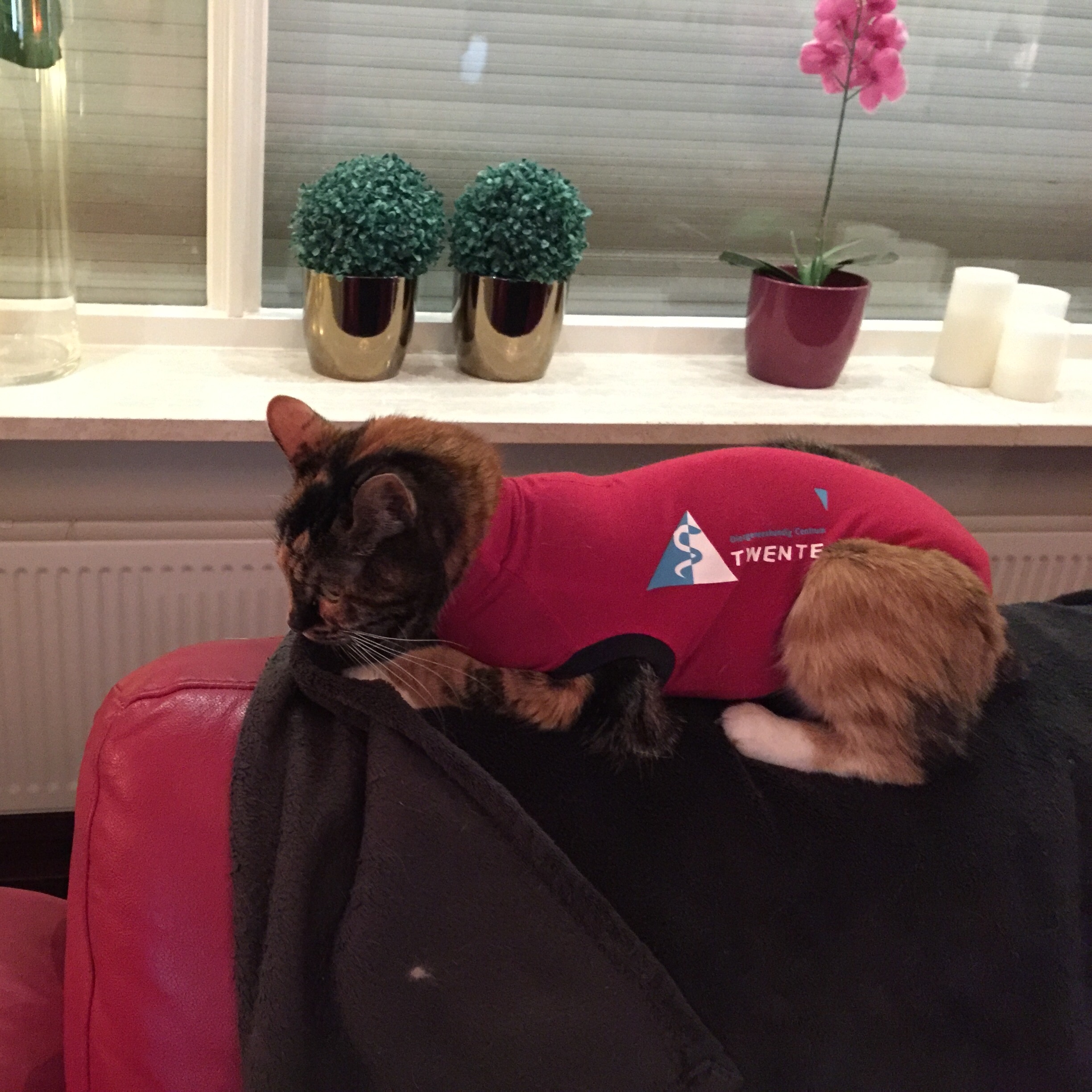 Thuisgekomen heb ik niets meer gedaan, behalve lekker kroelen met Romy en met bewondering kijken naar de gekke bewegingen die ze maakt nu ze dat “gekke jasje” aan heeft. Dan weer loopt ze alsof ze dronken is, dan weer alsof ze een kitten is die nog niet weet hoe ze haar pootjes moet gebruiken. Ergens is het nog wel lachwekkend om te zien… Uiteindelijk is het elf uur als ik m’n bed in rol, en Romy mag vannacht lekker bij ons op bed slapen. Morgen even geen wekker om zes uur…