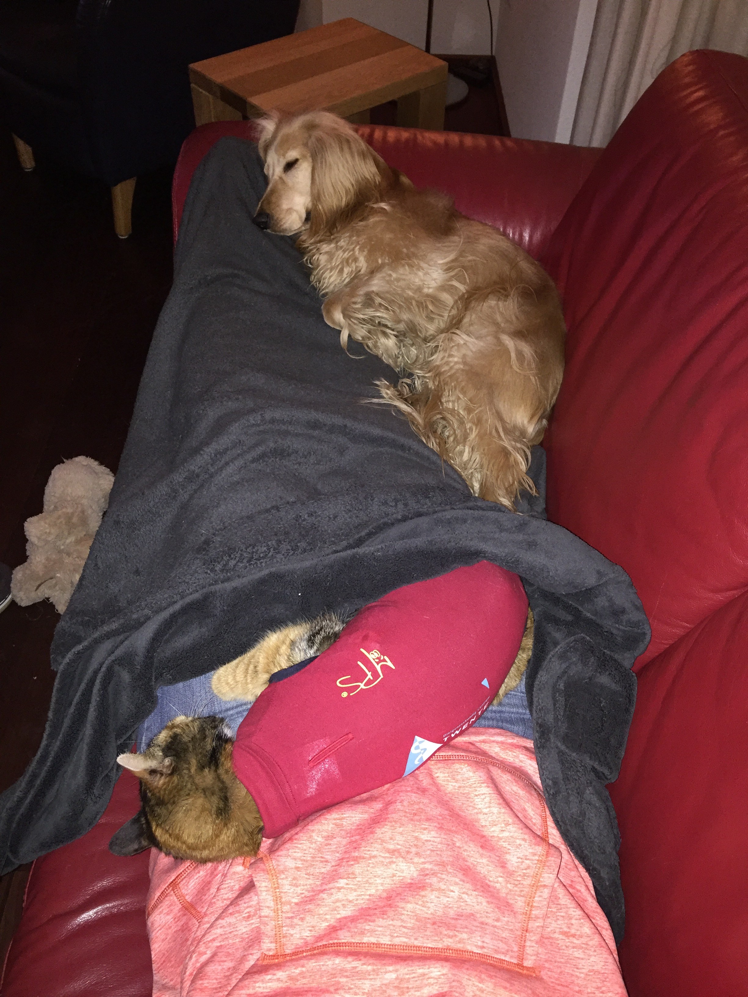 Vanavond heb ik lekker op de bank gelegen met de poes op schoot, en de hond aan m’n voeten, lekker beetje lezen. Heerlijk!