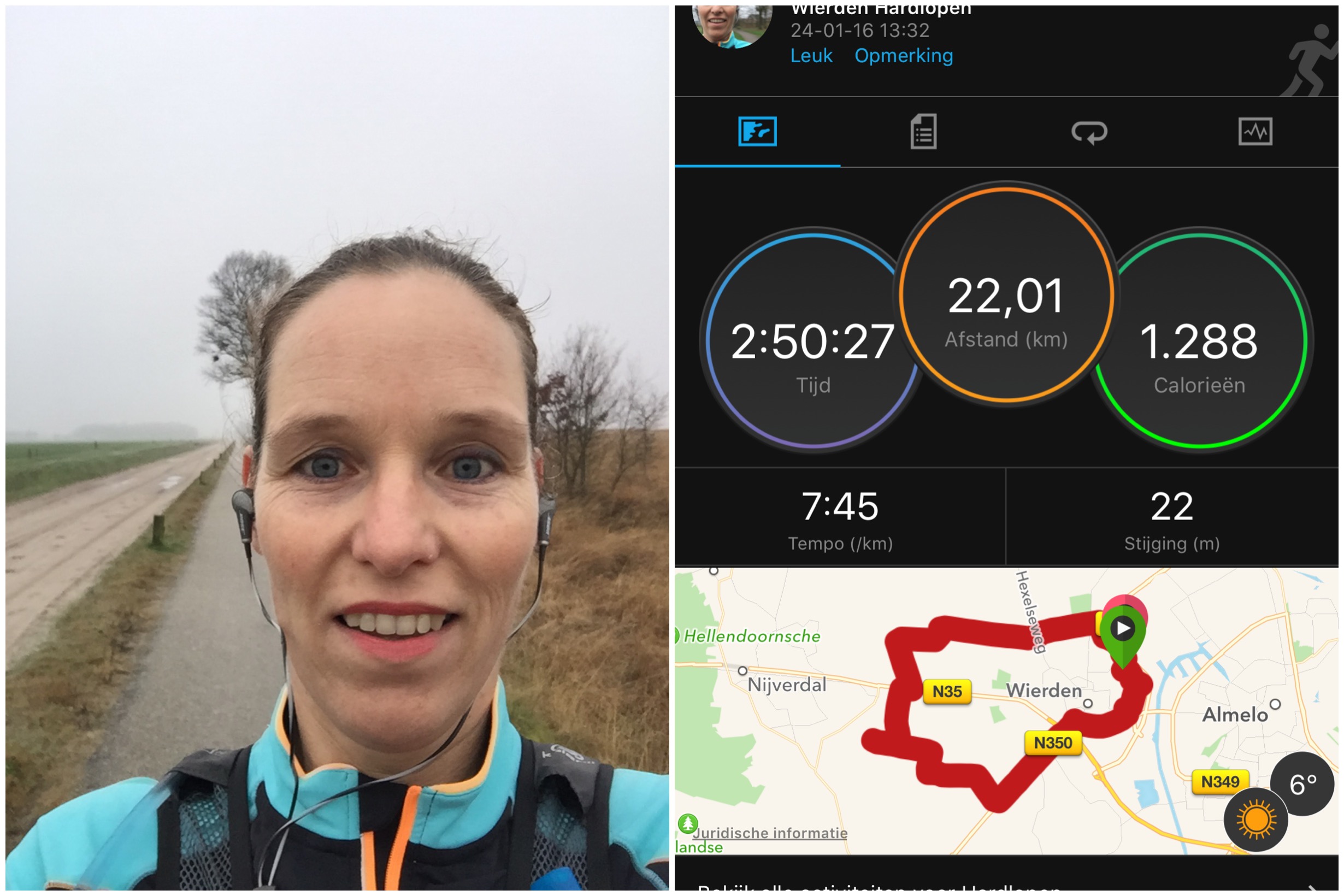 Zondag trok ik uiteindelijk pas weer m’n loopschoenen aan. Zonder doel, zonder plan vertrok ik in m’n eentje met muziek, trail-rugzak en gelletjes. Uiteindelijk kwam ik zo fijn in een flow, dat ik zelfs meer dan ooit liep! Na 22 km kwam ik weer thuis, met een hoofd dat een stuk leger was en beter georganiseerde gedachten.
